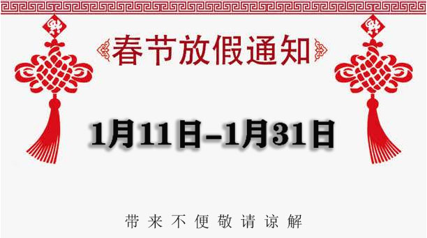 新年的年假即將開始了,忙碌了一年的我們放下一切,好好休養(yǎng)生息,好迎接更美好的一年,1月11號-1月31號,我們公司就進入休息期,給您帶來不便,敬請諒解,請允許我們用短時間的假期,調(diào)整狀態(tài),過完年,用熱情的,真摯的,飽滿的情緒,為您服務(wù)!