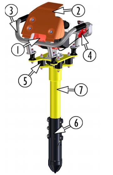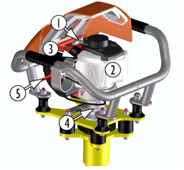 該機采用汽油機與搗固裝置直接連接的設(shè)計結(jié)構(gòu),主要由汽油機、減震裝置、傳動 軸、振動體和扶手組成。汽油機的動力經(jīng)離心式離合器帶動傳動軸組件,傳動軸的下端安裝有一定 質(zhì)量和偏心距的偏心塊,在汽油機的驅(qū)動下產(chǎn)生了的激振力 (離心力) ,當(dāng)鎬頭接觸道床石砟時鎬 頭周圍石碴也參加振動并產(chǎn)生一定范圍的流動,在下插力和振動力的共同作用下使枕木下石砟均勻流動、重新排列,達(dá)到搗固的目的。