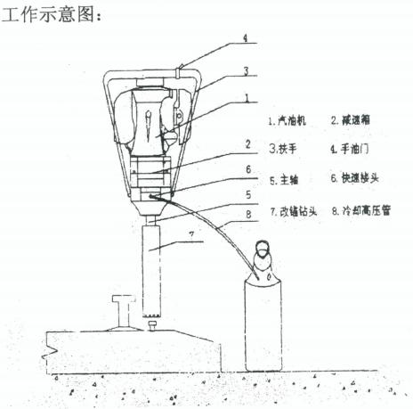 二沖程發(fā)動(dòng)機(jī)為動(dòng)力,經(jīng)由變速箱減速驅(qū)動(dòng)砼枕空心鉆頭來完成理想的鉆取作業(yè),當(dāng)砼枕改錨作業(yè)時(shí)擰上所需的鉆頭接通冷卻水壺便可開始工作。